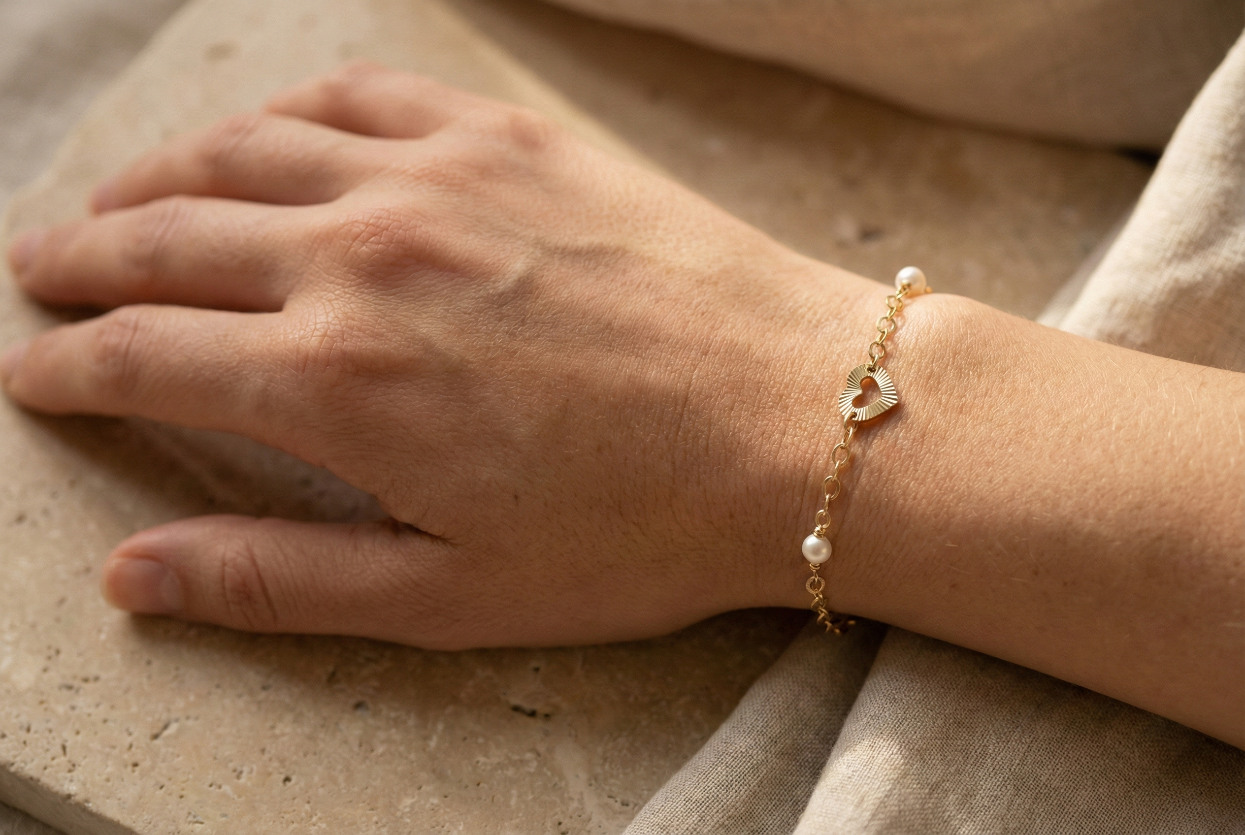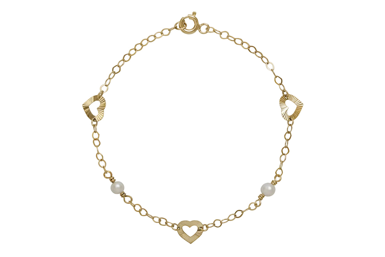 Βραχιόλι από χρυσό 14 καρατίων με ανάγλυφα μοτίβα καρδιάς και μαργαριτάρια