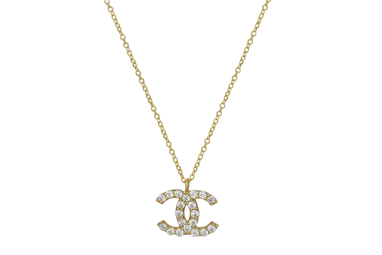 • Χρυσός 14 καρατίων • Λευκές πέτρες ζιργκόν • Μοτίβο εμπνευσμένο από την Chanel • Μορφή κολιέ • Σύγχρονη κομψότητα