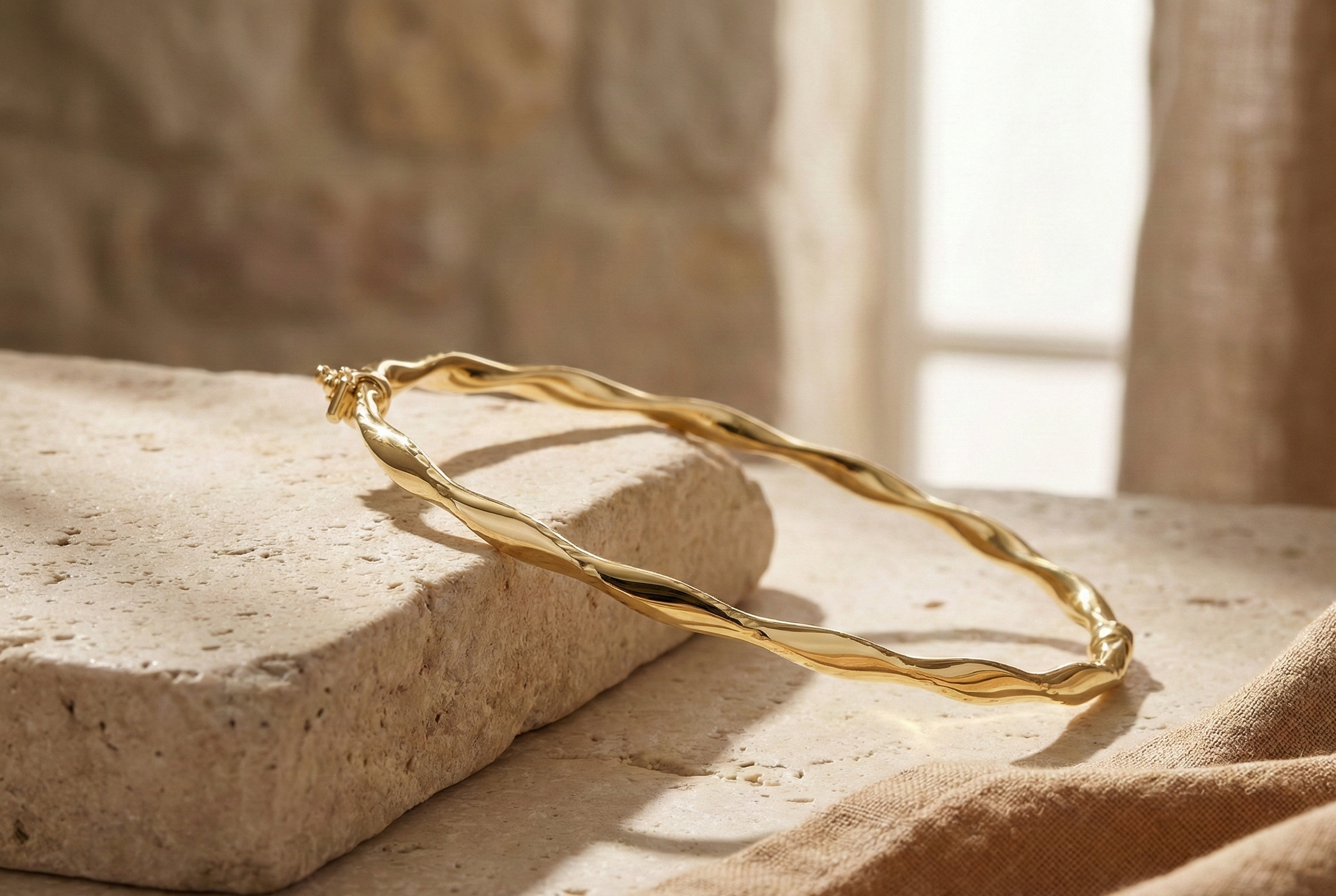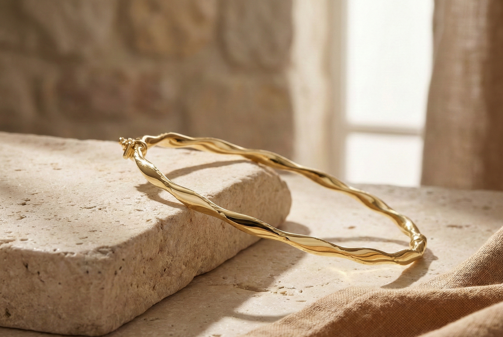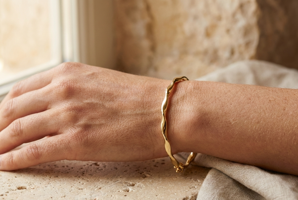 Βραχιόλι με ανοιχτή μανσέτα, κατασκευασμένο από στριφτό γυαλισμένο χρυσό 14 καρατίων.