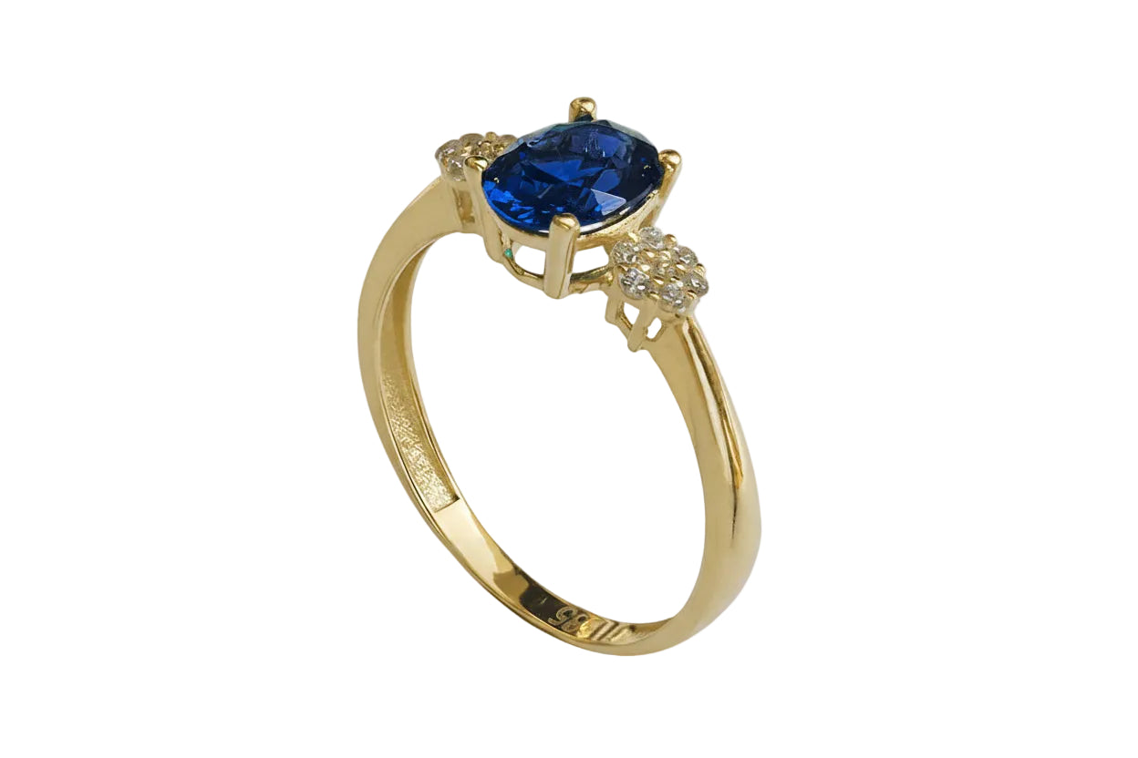 14K Gold Ring with Oval Blue Stone, Rosette Accents, and White Zircon Stones