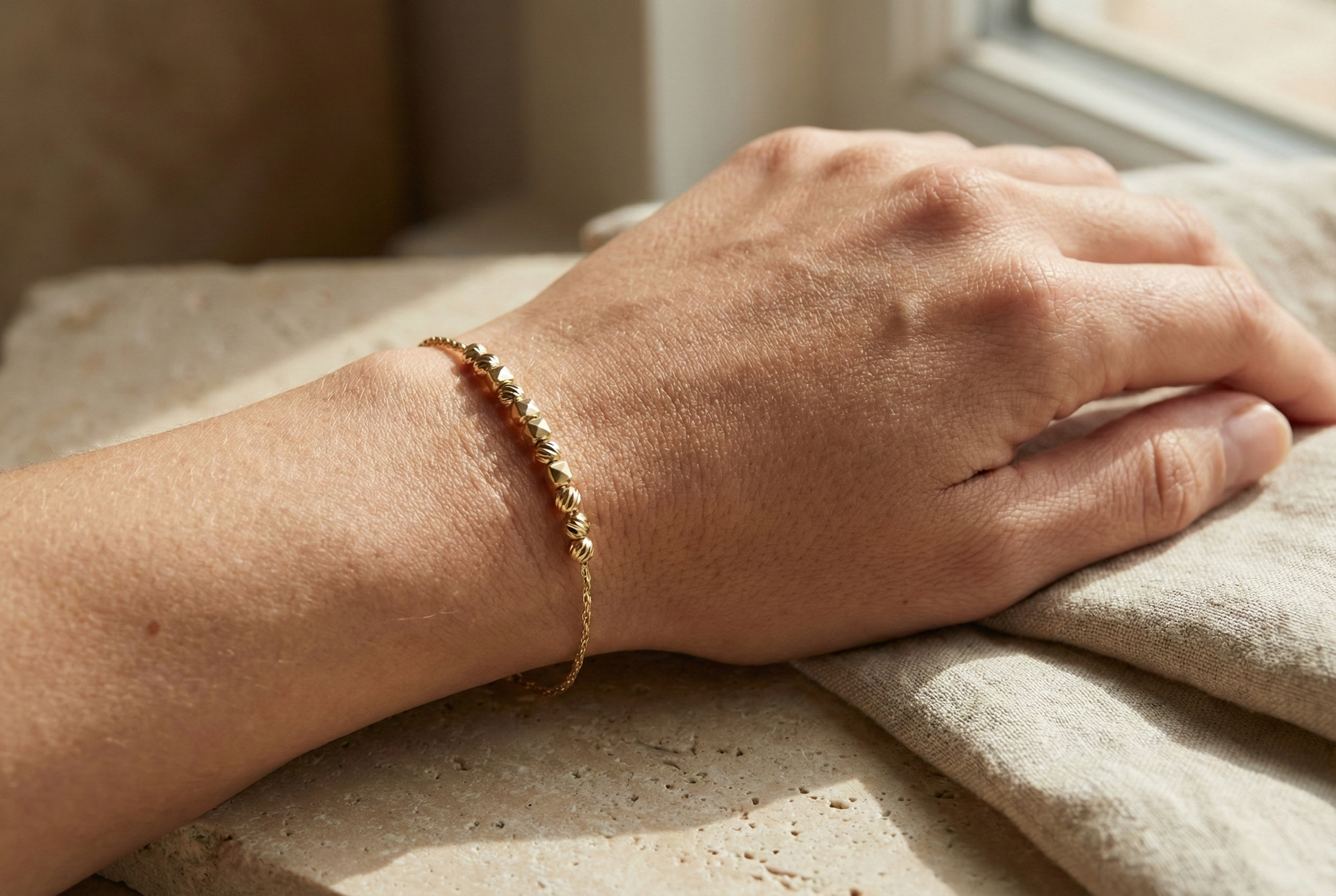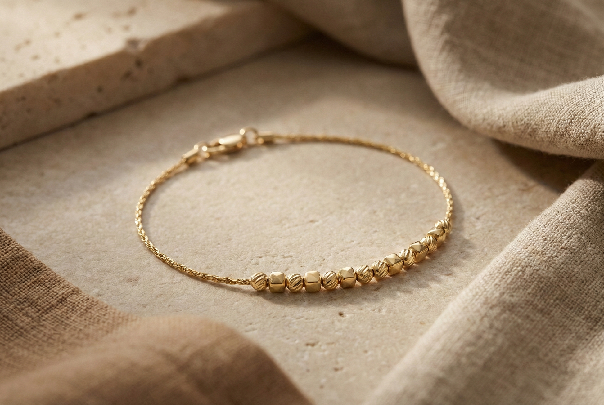 14K Polished Gold Bracelet with Cubes and Beads