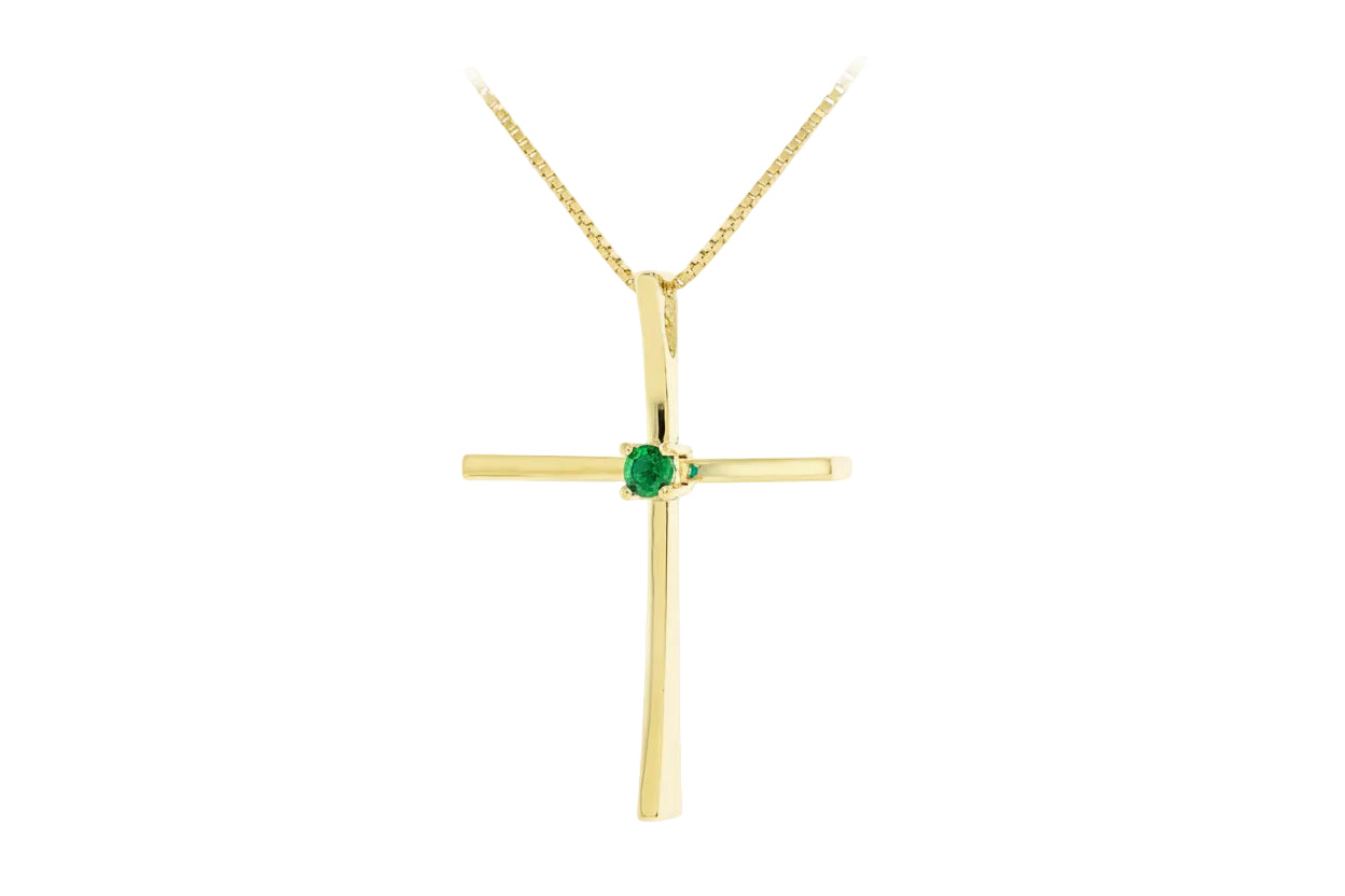Cross necklace crafted in 14K gold featuring green zircon centerpiece.