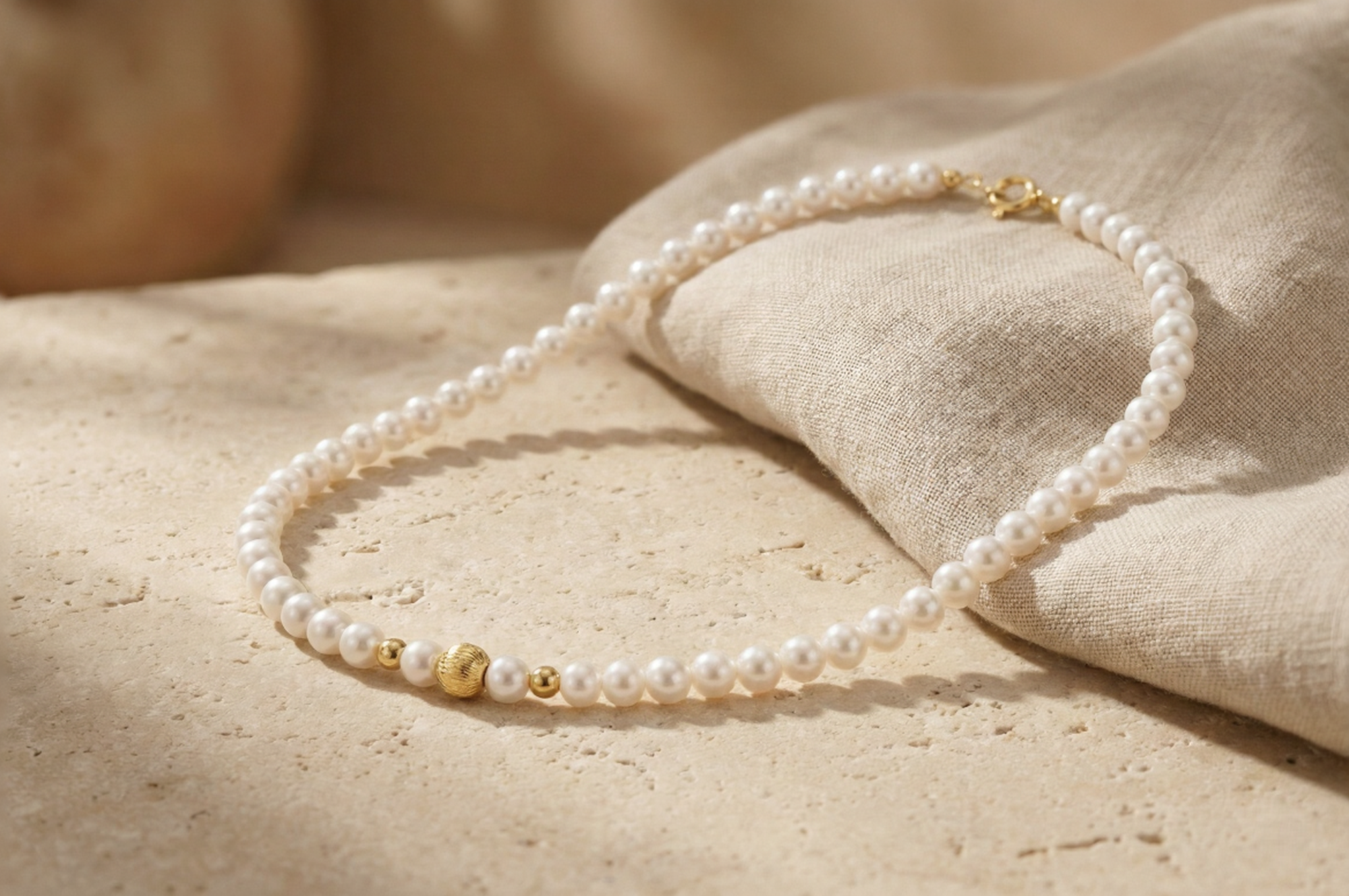 Necklace crafted in 14K gold combining pearls with polished gold beads.