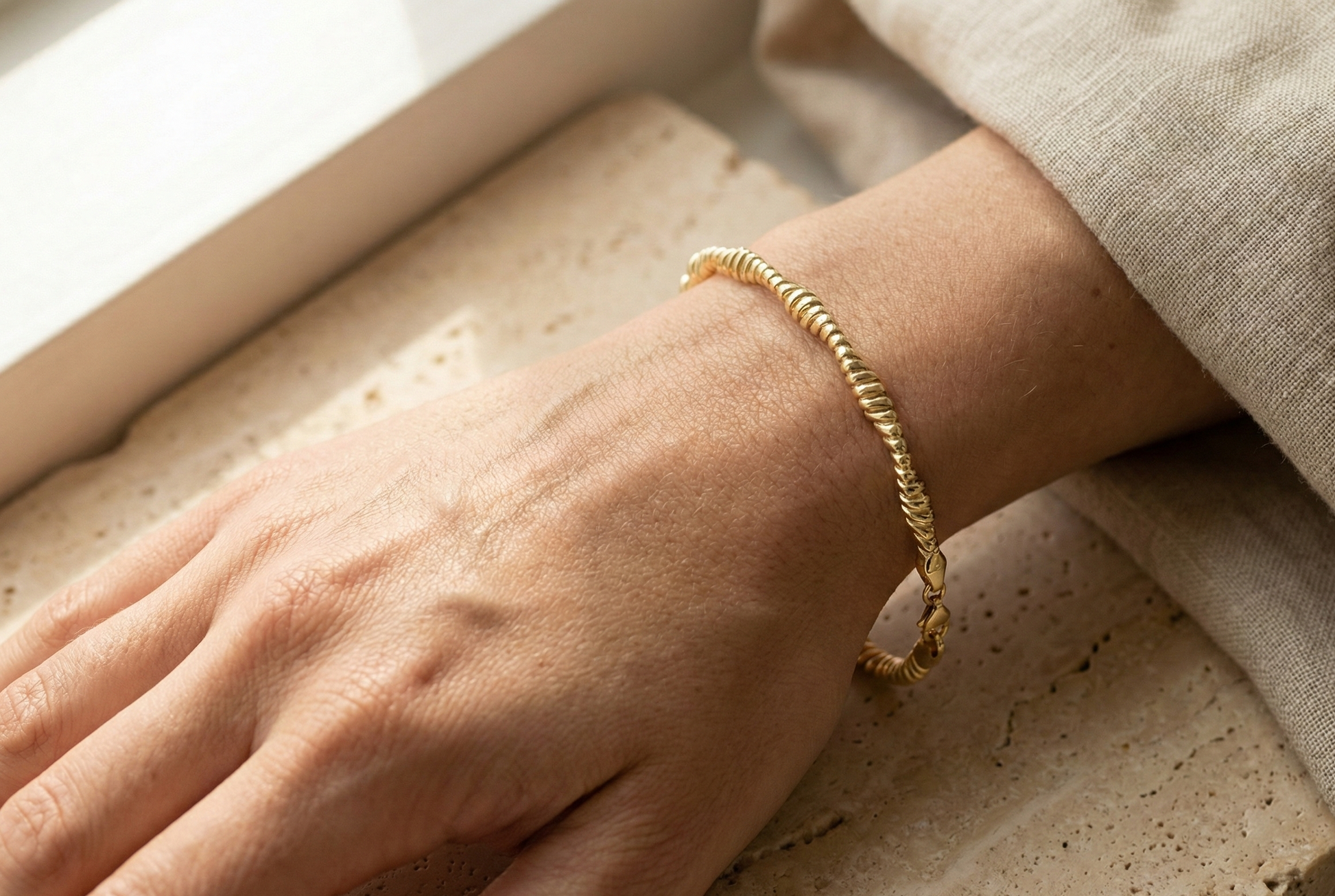 Twisted bracelet crafted in polished 14K gold. Subtle sculptural effect. • 14K gold