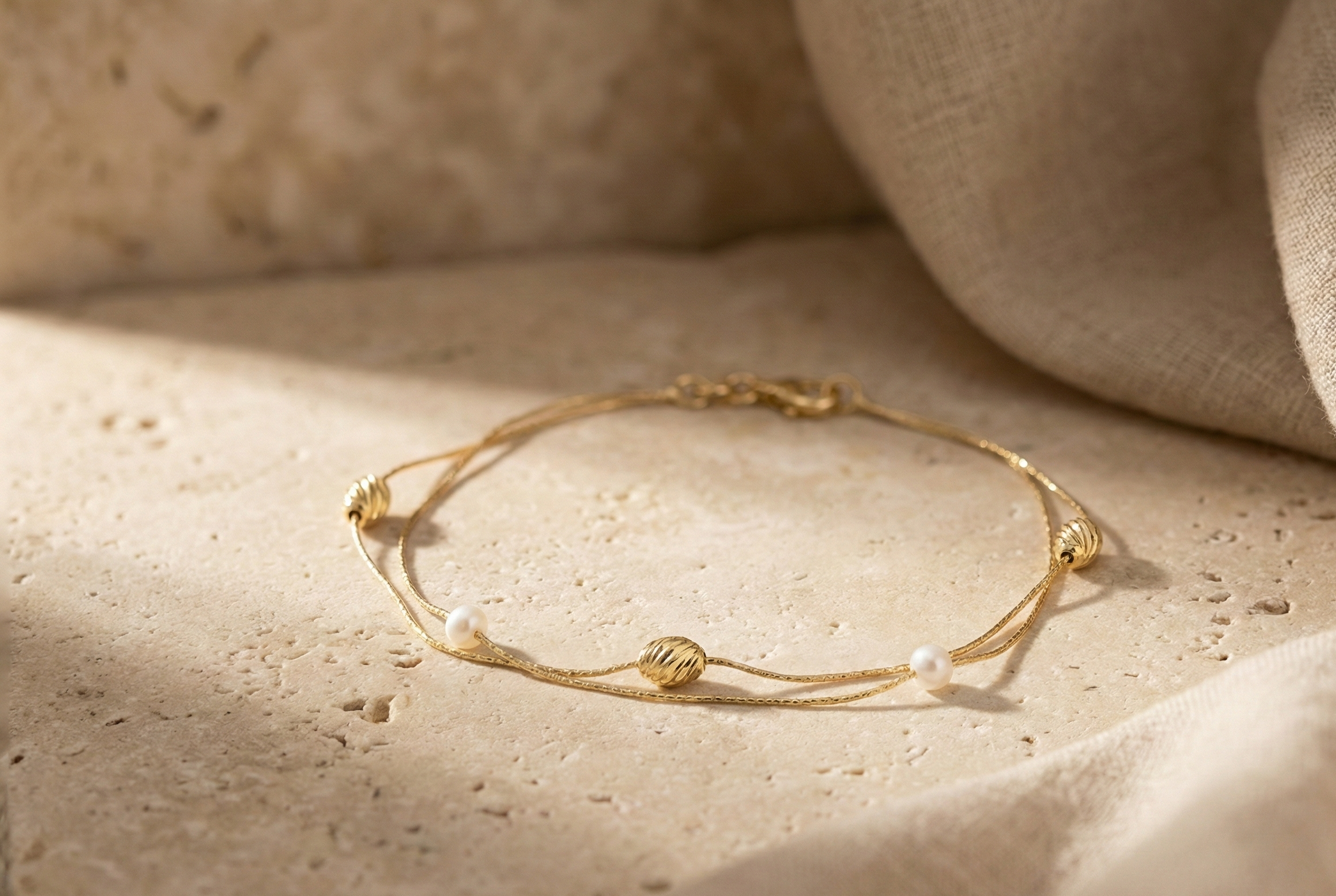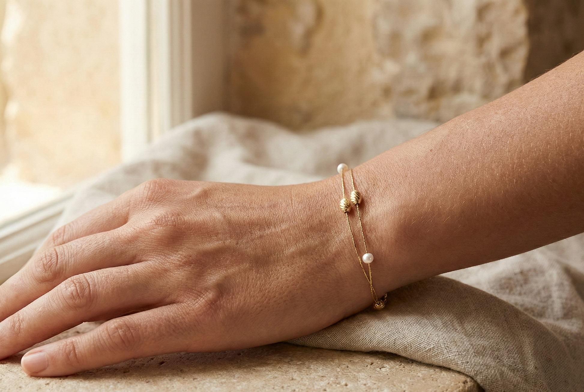 Women’s Double Bracelet with Pearls and Gold Beads, 14K Gold